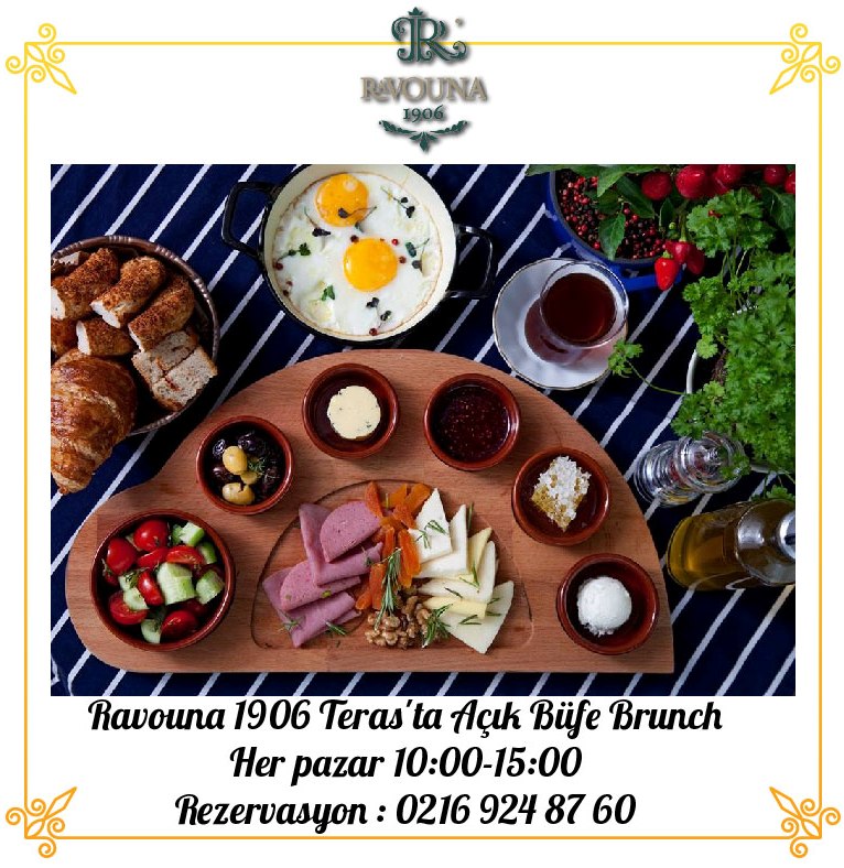 Ravouna 1906 mutfak ekibinin yaratıcı yorumları ile Türk ve Dünya Mutfak lezzetlerinin, kahvaltı klasikleriyle buluştuğu, “ Ravouna 1906 Brunch” her Pazar , lezzet ve keyif sunuyor. Sabah 10:00’da başlayıp 15:00’a dek süren brunchımıza 12:00’de Barbekü de dahil oluyor. Bu benzersiz deneyimi bizimle paylaşmak isteyen tüm misafirlerimizi her Pazar terasımıza bekleriz.